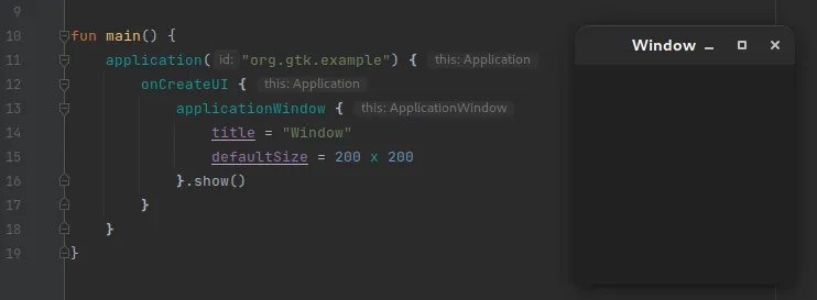 gtk-kt是 GTK API 的 Kotlin 绑定。允许熟悉 Java / Kotlin 的开发者轻松编写 GTK 应用程序。它也是新程序员开始创建 GTK 应用程序的一种简单安全的方式,只需要 10 行 & 154 个字符就可以创建一个简单的窗口。与需要 26 行和 602 个字符的 C 相比,减少了惊人的 75% 的字符来创建一个简单的窗口,想象一下对于具有更复杂组件的更大的项目。