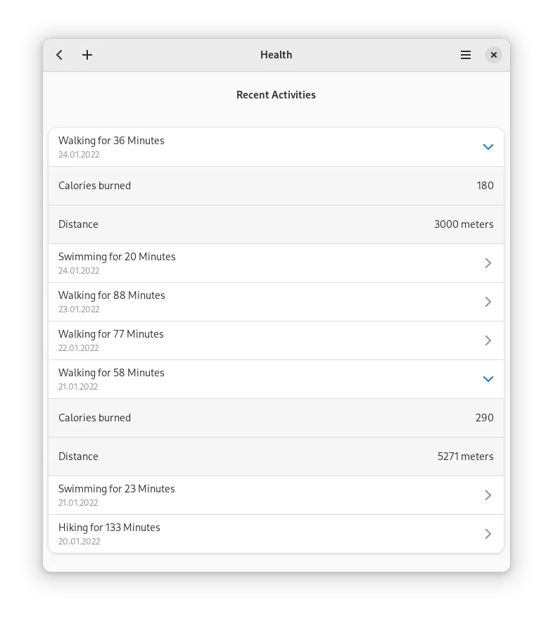 Health 的通知已被重构 - 不再启动单独的守护进程,Health 本身现在可以 DBus 激活,并通过 GApplication 服务发送通知。此外,Health 的 UI 文件已移植到 Blueprint,并且活动概览已切换到
