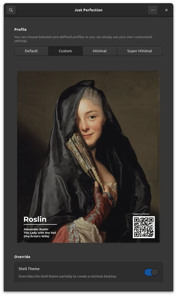 Just Perfection 扩展第 17 版已发布,包含 一些错误修复。此外,面板圆角大小 选项已为 GNOME Shell 42 移除。此版本以 Alexander Roslin(瑞典肖像画家)命名。