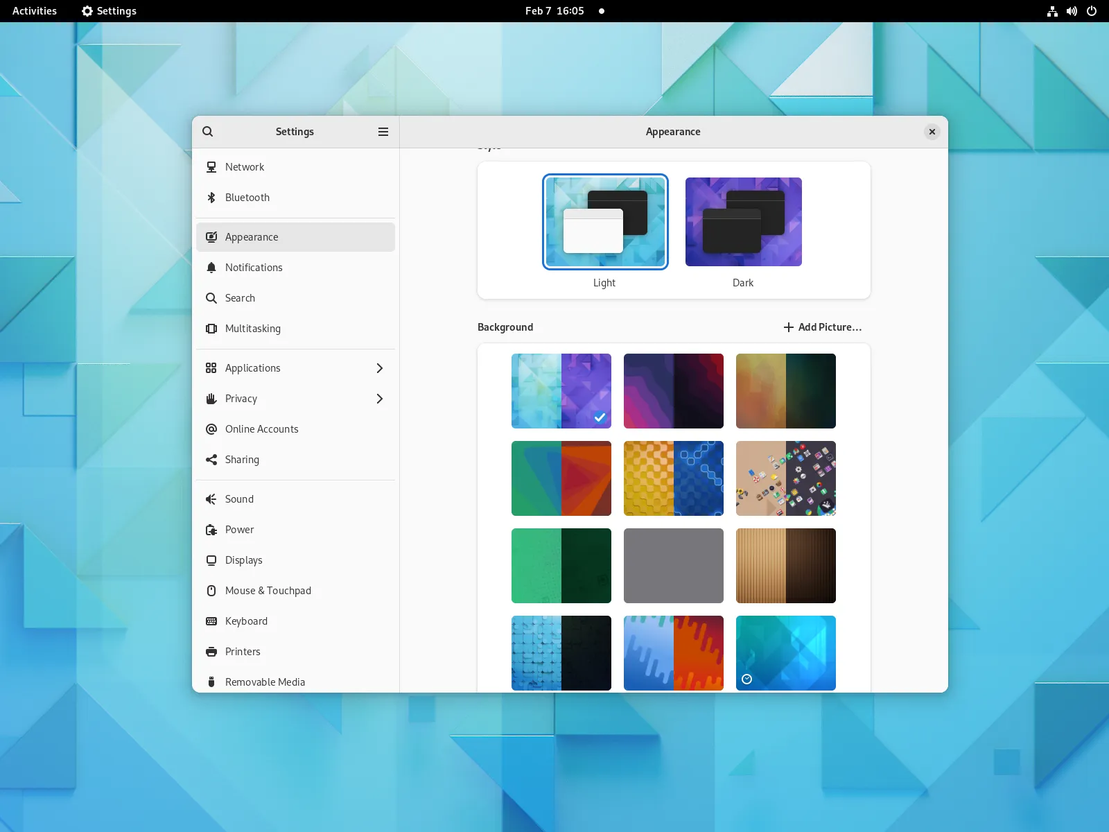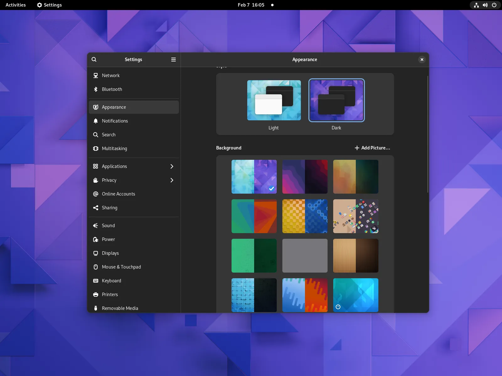 背景现在可以根据亮色/暗色偏好进行更改。感谢 Jakub Steiner 制作所有默认背景的深色版本,以及 Georges Stavracas (feaneron) 的评审