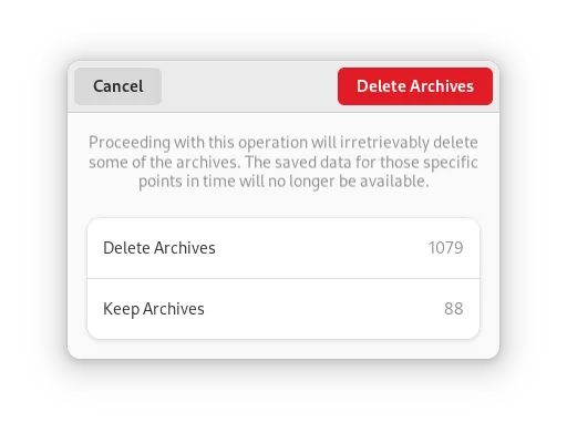 本周 Pika Backup 获得了一个用于删除旧备份存档的界面。删除操作基于用户定义的保留规则。进行了大量的重构,以便于显示 BorgBackup 进程(除了备份创建)的进度。