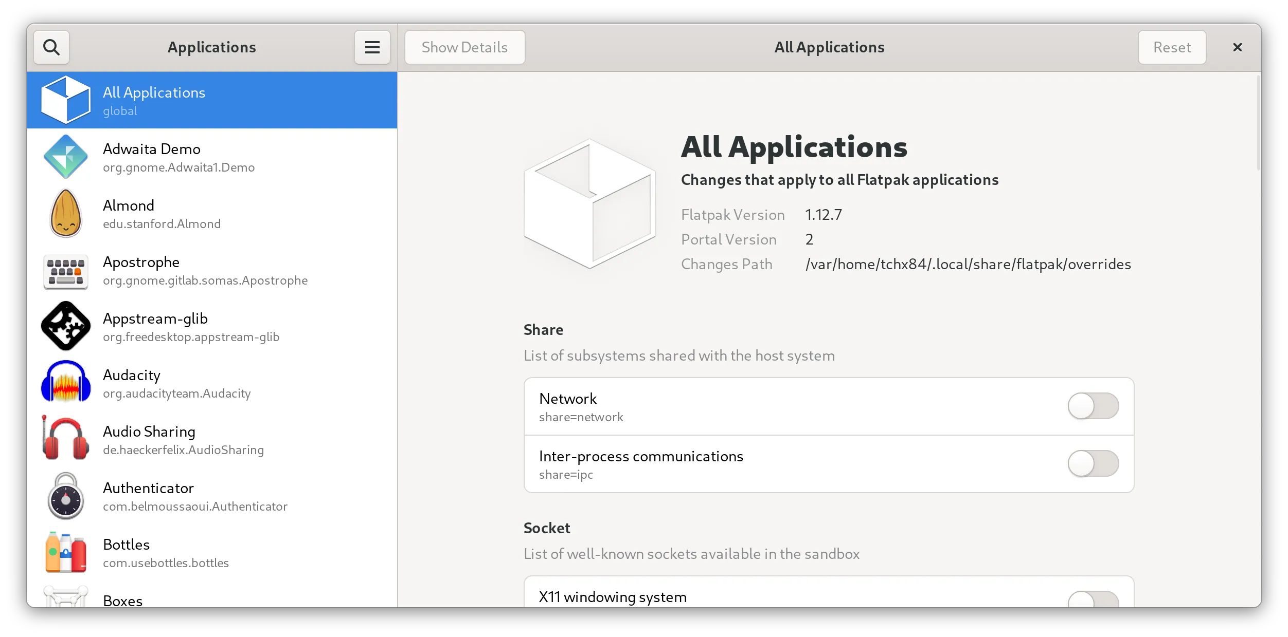 一个图形化实用程序,用于查看和修改 Flatpak 应用程序的权限。