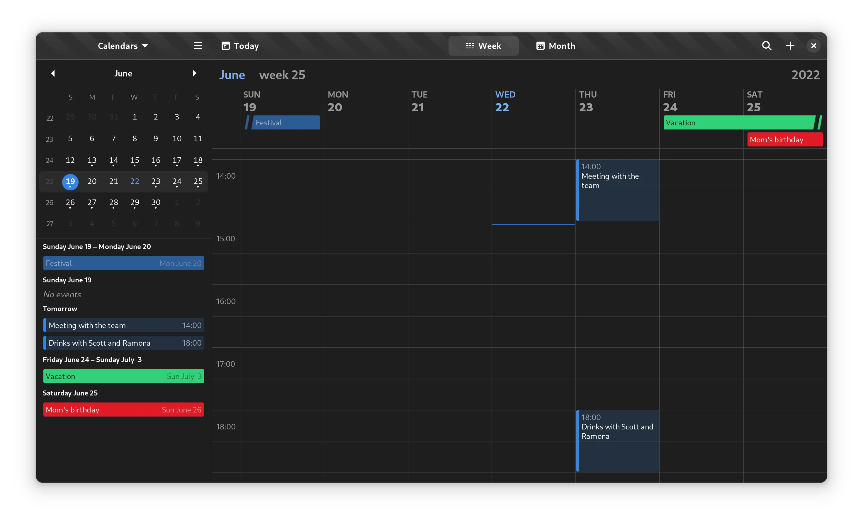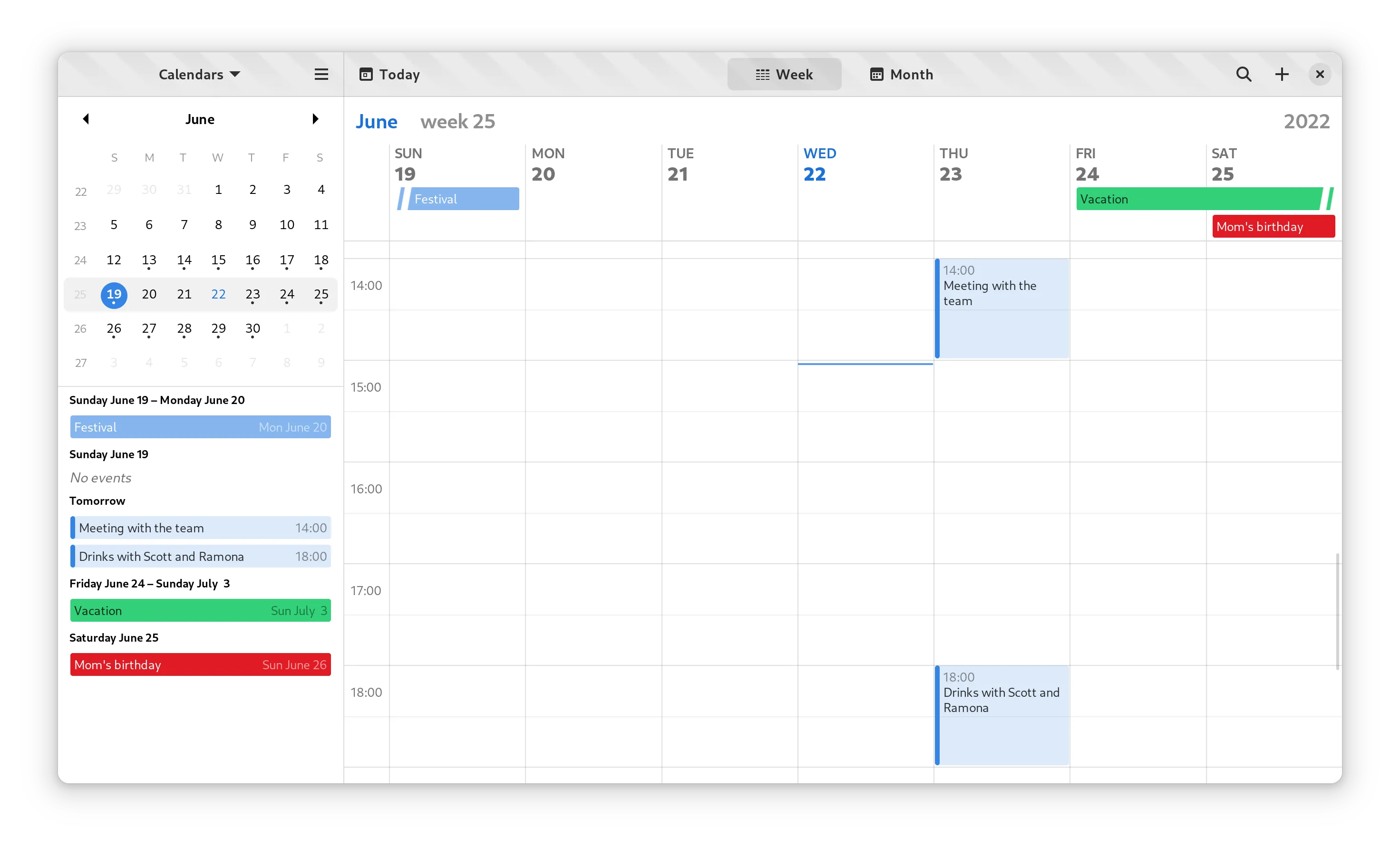 日历现在为其周视图添加了捏合手势 。它适用于触摸屏和触摸板,以及在按住 Ctrl 键的同时滚动。这将有助于应用程序在小型触摸屏(如 GNOME Mobile)上流畅运行。