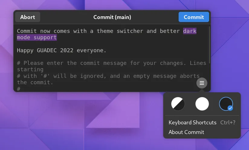 一个新的 Commit 消息编辑器 版本发布。它添加了主题切换器,更好的深色模式支持,改进的键盘支持以及修复了修改提交时自动大写的问题。