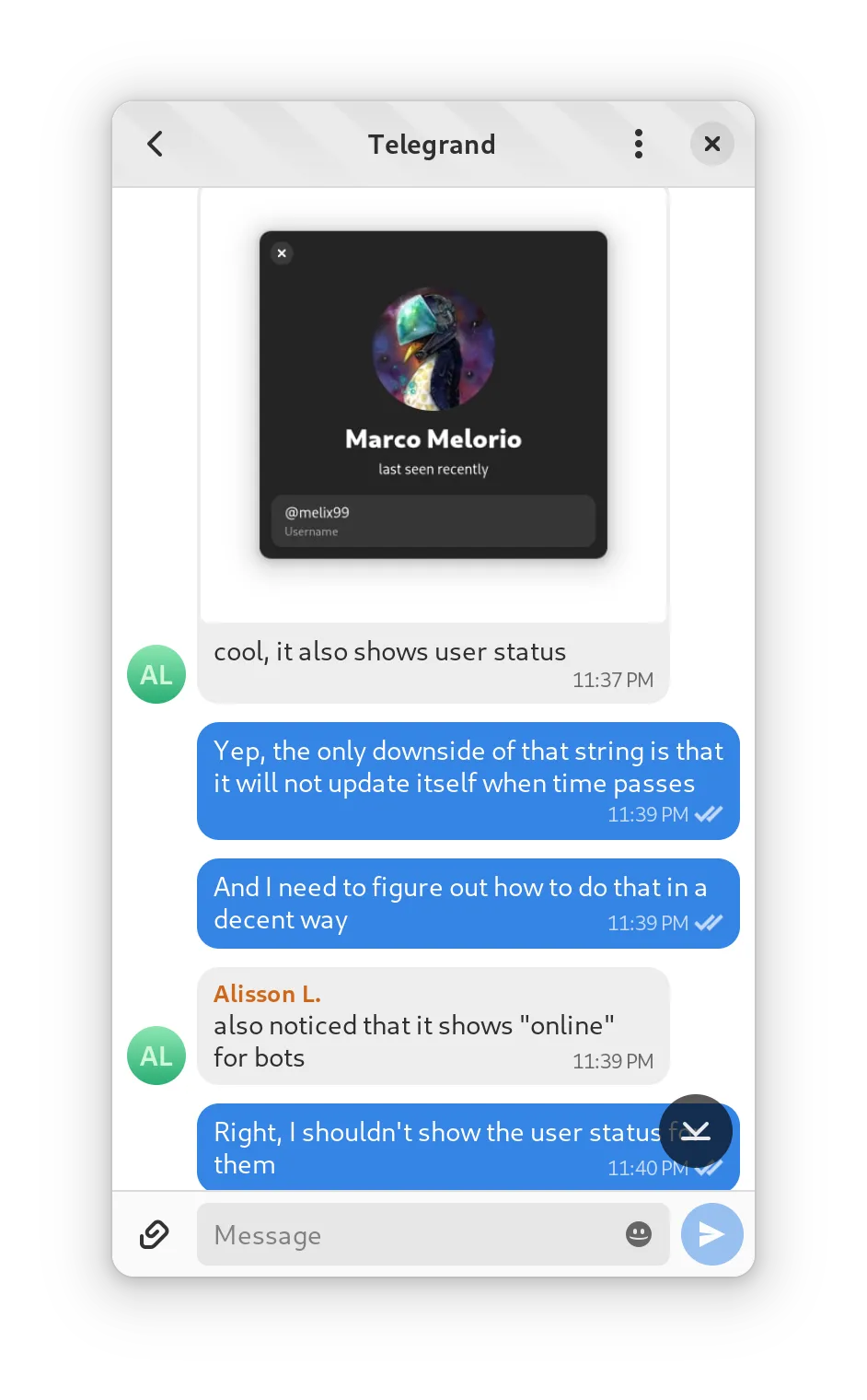 - 由 Marcus Behrendt 添加了聊天历史记录中的滚动到底部按钮