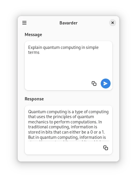 我发布了 Bavarder,一个与 AI 聊天的应用程序。使用 Bavarder,您可以向不同的提供商(如 Hugging Chat、BAI Chat、OpenAI GPT-3.5-turbo 等)提问。它的设计理念是简约,以便无需浏览器或帐户即可访问聊天机器人。