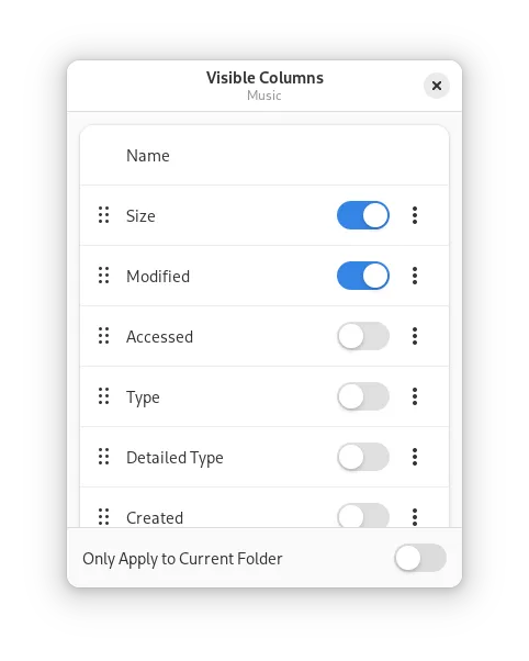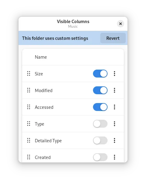 文件列表的列配置界面迎来全新设计!在使用了近 20 年相同的列选择器后,GtkTreeView 的弃用促使 Corey Berla 用包含现代小部件和设计的选择器取代了旧的选择器。这项增强功能,加上 Peter Eisenmann 的贡献,还允许更改全局或仅针对当前文件夹的可见列,而无需在“偏好设置”中重复旧的误导性界面。
