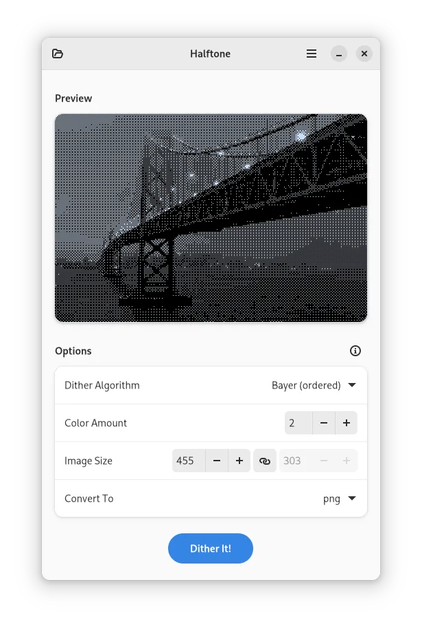 我发布了 Halftone,一个使用量化和抖动技术进行有损图像压缩的简单应用程序。使用 Halftone 为您的图像提供像素艺术风格,并在压缩文件大小的同时。您可以在 Github 上查看它。