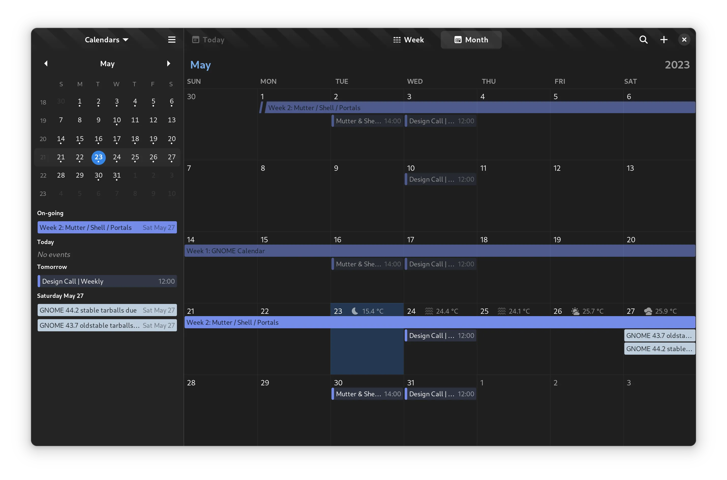 GNOME 日历在 libadwaita 提供的新的组件基础上进行了一次小小的改进。现在它具有更好划分的侧边栏,并且视图也具有统一的外观。