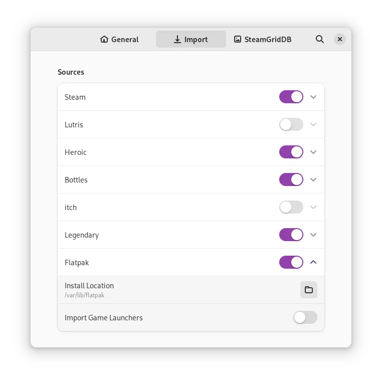 添加了两个新的导入源:Legendary 和 Flatpak。