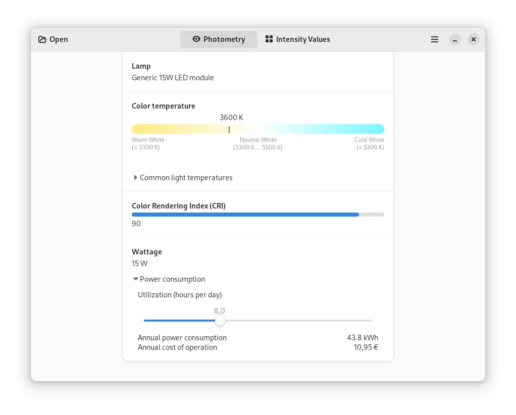 自 TWIG 上次发布以来,光度学观察器现在能够 IESNA 和 EULUMDAT 文件格式之间进行转换。此外,你还可以将光度数据导出为 CSV 和 JSON 格式,以及 PNG 或 SVG 格式的光分布曲线。此外,该软件现在允许你计算灯具的年度功耗,并将其发光颜色温度与常见光源进行比较。除了英语,该应用程序还提供德语和波兰语版本。