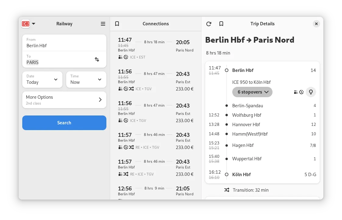Railway 2.2.0 版本发布。此版本包含许多小的质量改进和 UI 改进。它添加了提供程序列表的过滤器,以及旅程上次刷新时间的指示器。Railway 现在还可以保存窗口大小,在内容加载时禁用一些按钮,并且不再在刷新旅程时折叠旅程段。Railway 现在还可以使用 Weblate 进行翻译,并且已经提供荷兰语、法语和德语版本。