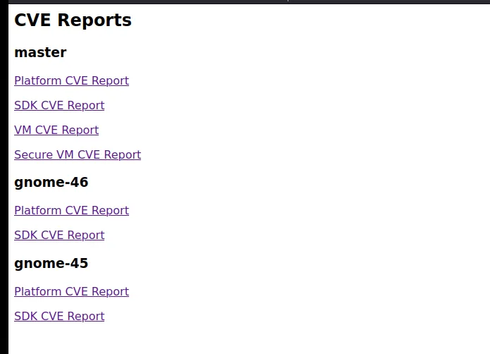 这些更改包括为 master 和所有未来的受支持发布分支生成额外的 CVE 报告,用于 vm 和 vm-secure 清单。我们还利用 Gitlab Pages 自动发布不仅 master 分支的 CVE 报告,还发布每个当前受支持发布分支的报告。可以通过新添加的徽章在 gnome-build-meta 的 README 的顶部获得这些单独报告的列表。