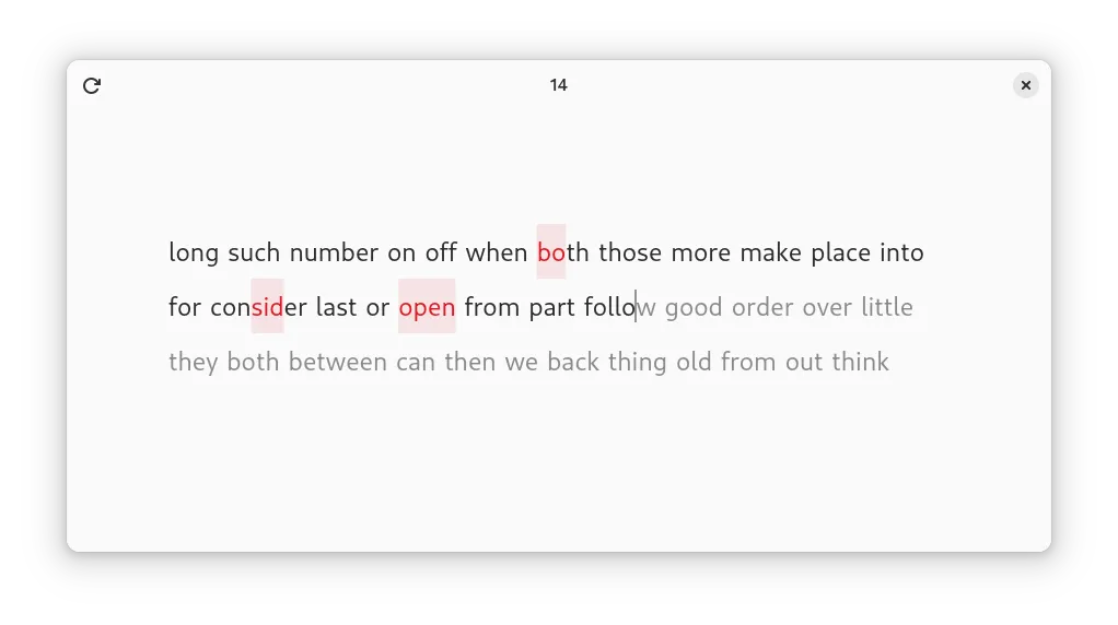 我为此工作了几个月,现在终于发布了。Keypunch 允许您使用您选择的语言自动生成的伪文本来练习打字技能。或者,您可以向它提供您自己的文本,例如歌曲歌词、维基百科文章和引言。准备好加速您的打字速度吧!