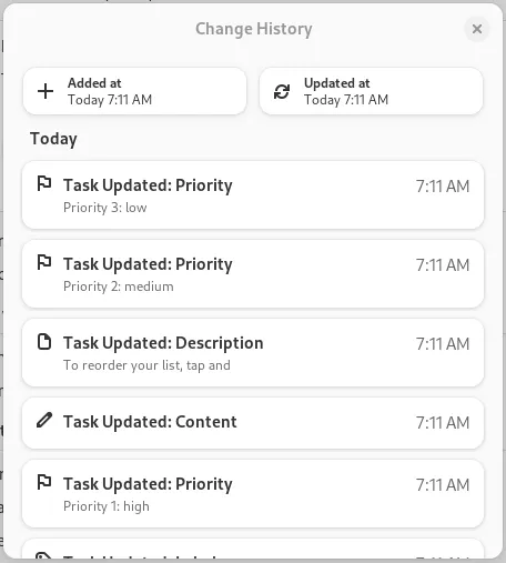 每个任务的更改历史记录 您是否想知道您何时对任务进行了修改? 通过新的更改历史记录功能,您现在可以看到对每个任务所做的所有更改。 此功能允许您跟踪和撤消更改,确保您始终完全控制您的任务。