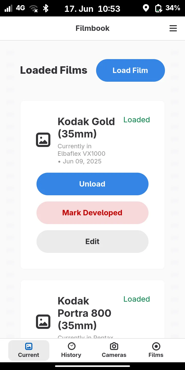 所以,这里有一个为那些不再知道是否插入了胶片的摄影师准备的应用程序。该应用程序名为 Filmbook,分为 4 个部分。第一个选项卡“当前”显示带有插入胶片的相机列表。“历史记录”选项卡显示哪些相机装载了哪些胶片。此外,相机-胶片对可以标记为已冲洗。第三和第四个选项卡显示相机和胶片。