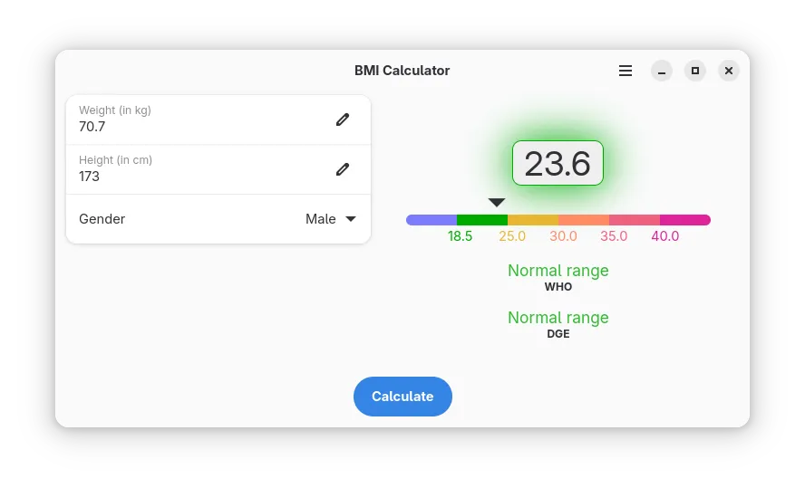 本周我发布了 BMI 计算器的新版本。现在它包括德语、意大利语和荷兰语的翻译。该应用程序会记住上次的条目,并且可以选择配色方案。你可以从 Flathub 安装该应用程序:https://flathub.org/apps/io.github.johannesboehler2.BmiCalculator