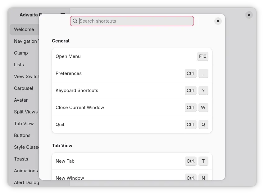 GtkShortcutsWindow提供了替代方案 -AdwShortcutsDialog。AdwShortcutLabel也作为一个单独的小部件提供,取代GtkShortcutLabel