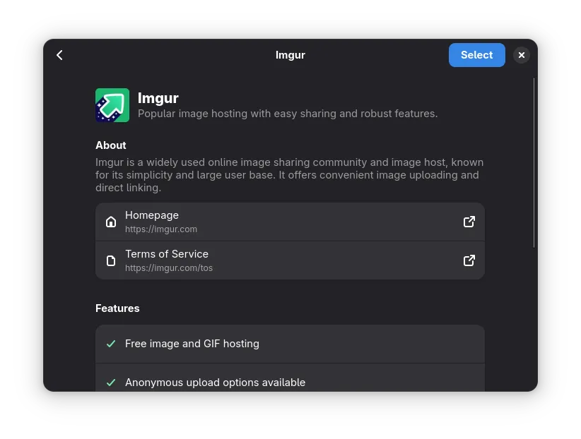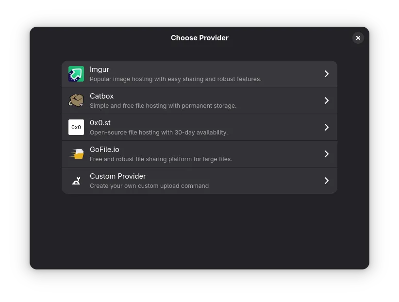 Gradia 已更新,可以使用户能够将编辑后的图像上传到他们选择的在线提供商。我确保用户充分了解这些服务,并且可以自由选择,而不会被迫使用任何特定的服务。与此功能相关的数据也可以动态更新,而无需新的发布,使我们能够快速解决任何数据质量问题,并在无需依赖额外的软件包维护人员干预的情况下更新提供商列表。